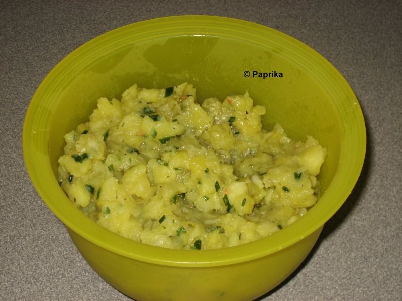 - 30 g Öl, 30 g Essig, 1 TL Salz, 0,25 TL Pfeffer a.d.M, 10 g gehackten Schnittlauch oder Petersilie, evtl. etwas Schmand und die gekochten Kartoffeln in Stücken zugeben und 5-10 Sek./Stufe 3 mit dem Spatel auf Sicht zerkleinern.