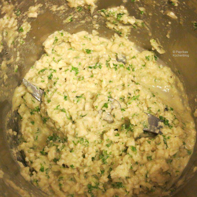 - 100 g Wasser, 200 g Blumenkohl, 10 g Petersilie (kurze Stile auch verwenden), 2 TL Mandelmus, 2 EL --> Lupinenmehl, 0,5 TL Salz, 0,25 TL Pfeffer a.d.M. und 0,5 TL Muskat frisch gerieben zugeben.